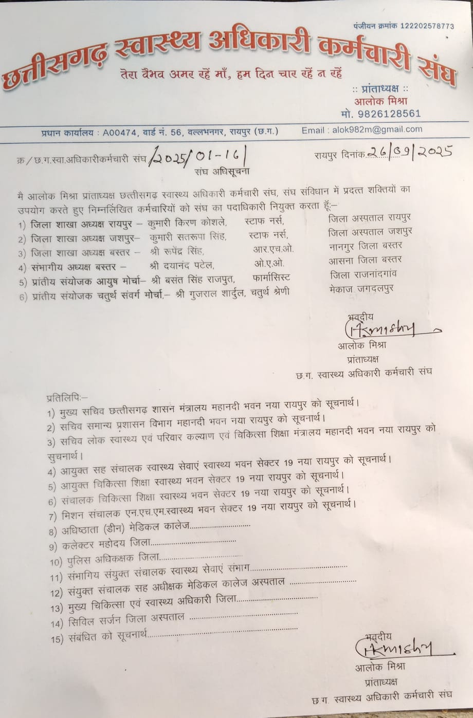छत्तीसगढ़ स्वास्थ्य अधिकारी कर्मचारी संघ ने बस्तर के लिए नए पदाधिकारियों की घोषणा की…..