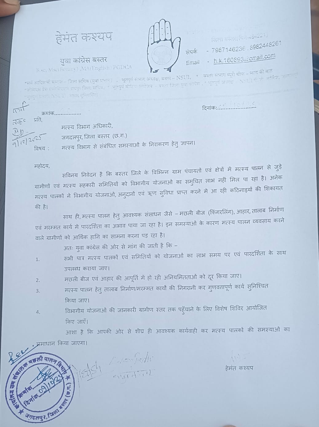 जगदलपुर (प्रभात क्रांति) । बस्तर जिला में मत्स्य विभाग से संबंधित समस्याओं के निराकरण हेतु युवा कांग्रेस जिला उपाध्यक्ष हेमंत कश्यप ने आज मत्स्य विभाग अधिकारी, जगदलपुर को ज्ञापन सौंपा।