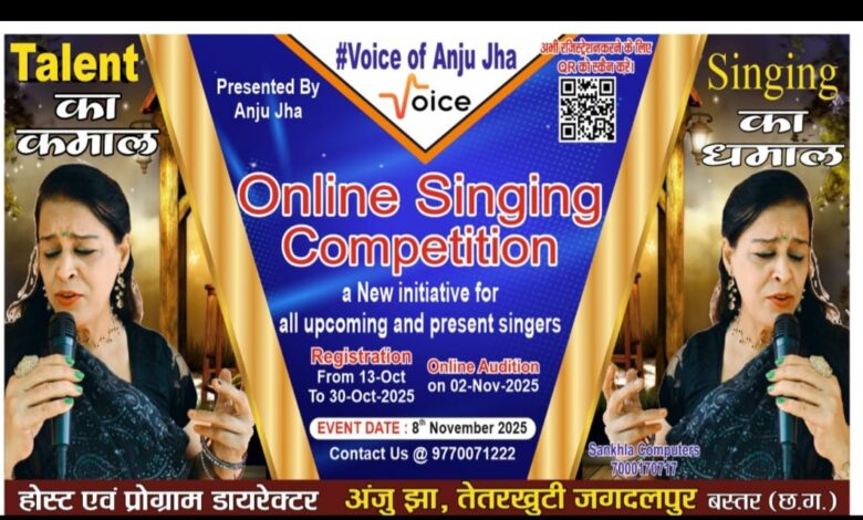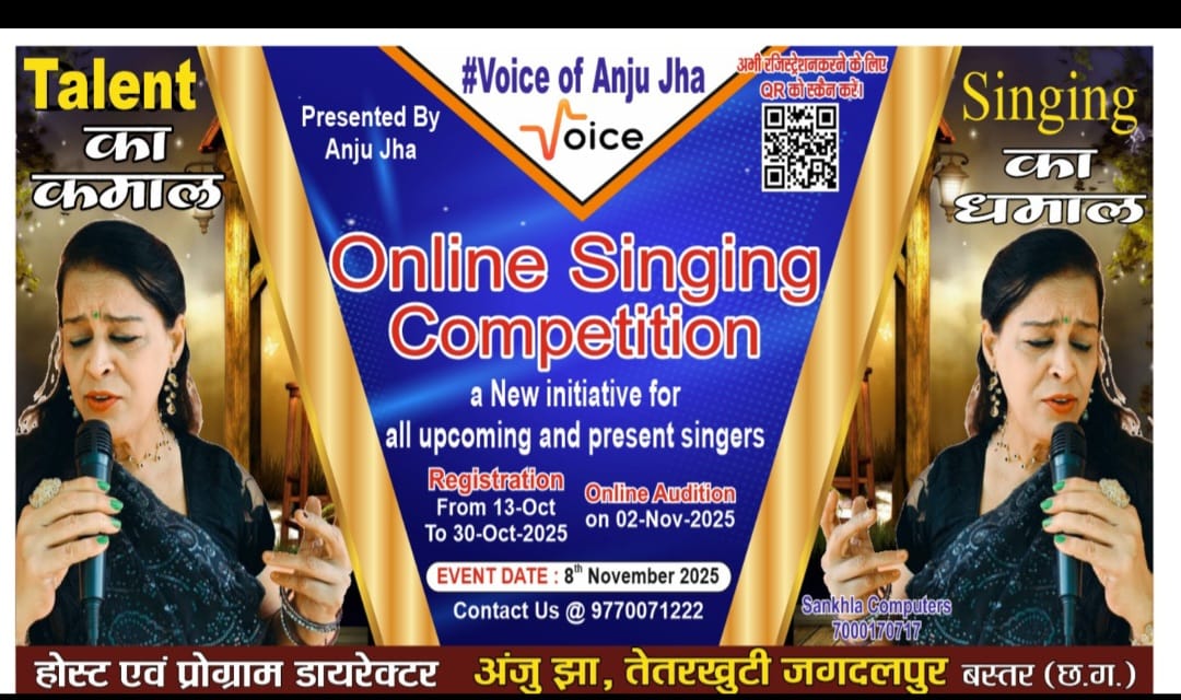 इस प्रतियोगिता का आयोजन श्रीमती अंजू झा (जगदलपुर) के द्वारा किया जा रहा है। उन्होंने बताया कि गायन में रुचि रखने वाले सभी इच्छुक प्रतिभागी इस प्रतियोगिता के लिए पंजीकरण करा सकते हैं।