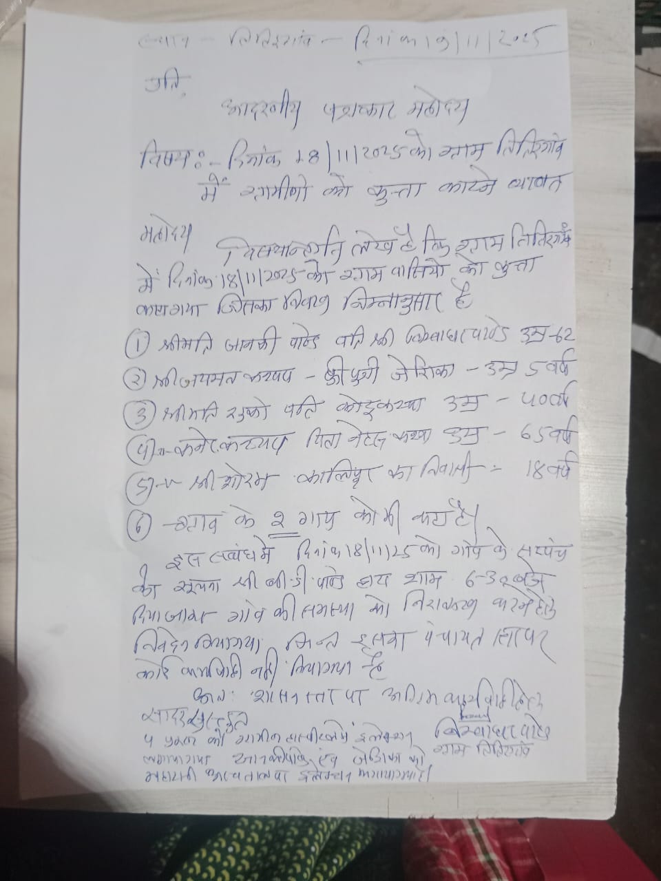 घायल ग्रामीणों के नाम – 1. जानकी पाण्डे (62 वर्ष), 2. जेसिका (05 वर्ष) 3. सुको (40 वर्ष) 4. कनेर कश्यप (65 वर्ष) 5. शोरम (18 वर्ष) इसके अलावा, कुत्तों ने गांव की दो गायों पर भी हमला किया और उन्हें घायल कर दिया ।