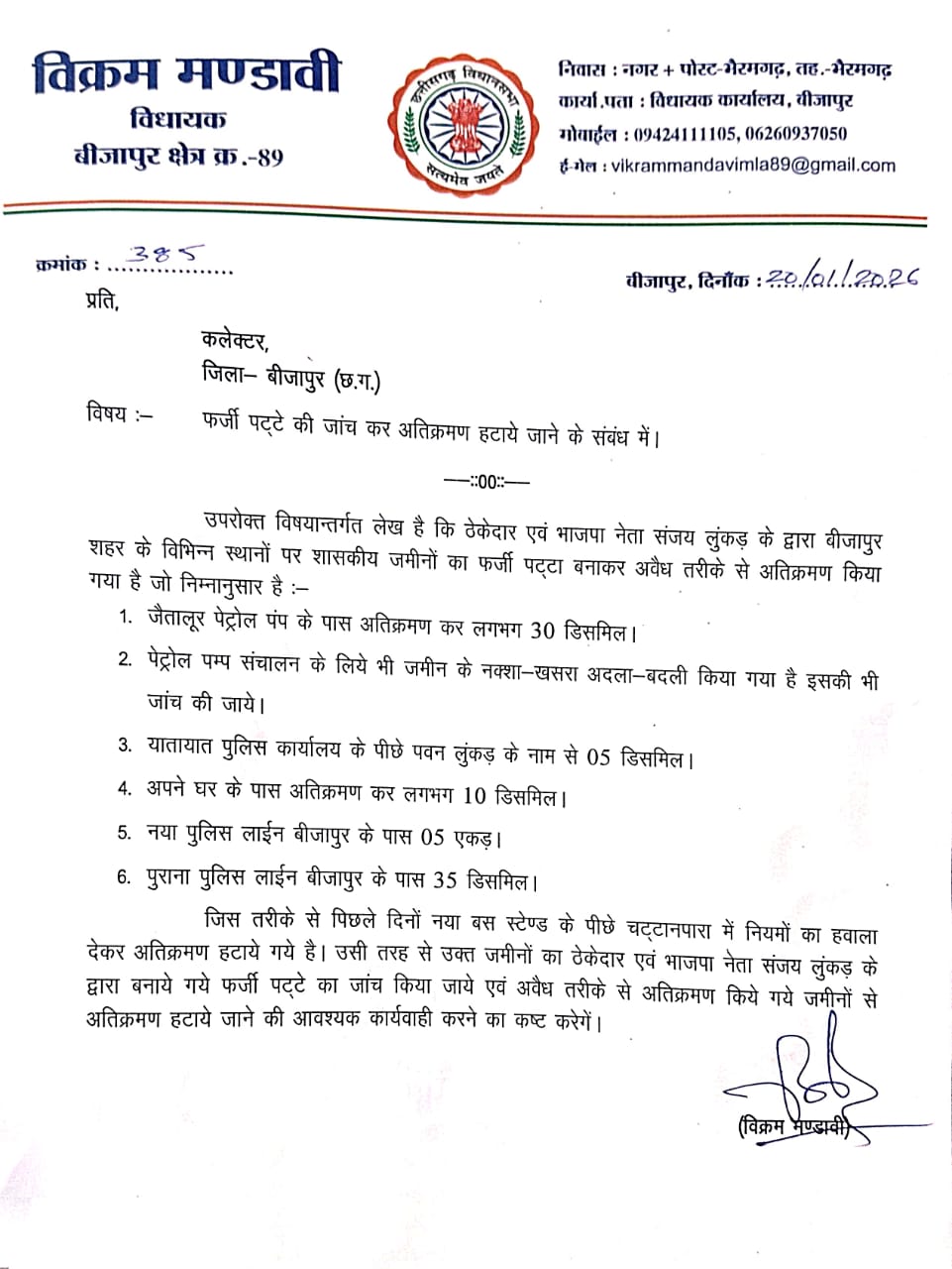 उन्होंने सवाल उठाया कि भाजपा की डबल इंजन सरकार ने संजय लुंकड़ को ये जमीनें कैसे आवंटित कीं? इसके मानदंड क्या थे? सरकार इनकी गहन जांच कराए और जांच रिपोर्ट सार्वजनिक करे, ताकि बीजापुर वासियों को पता चले कि यहाँ जमीनों का अतिक्रमण, कब्जा एवं पट्टा किस आधार पर दिया जाता है।
