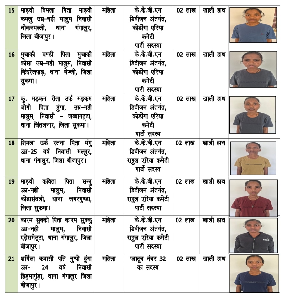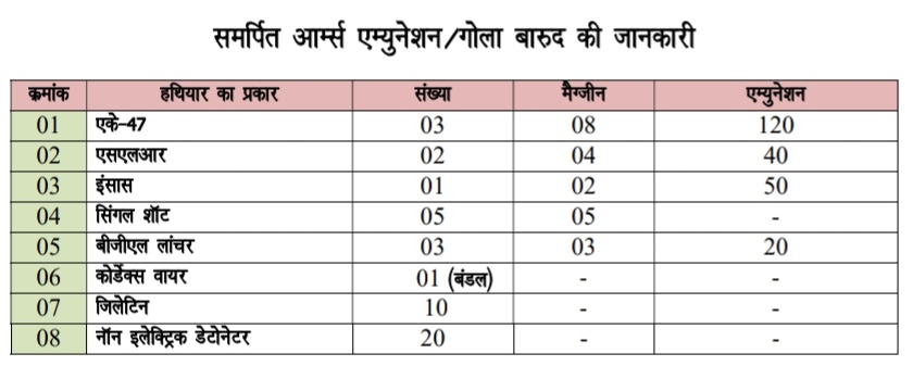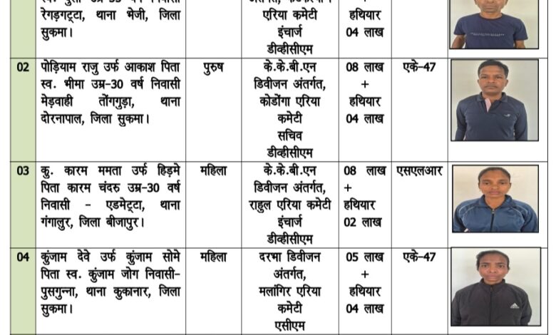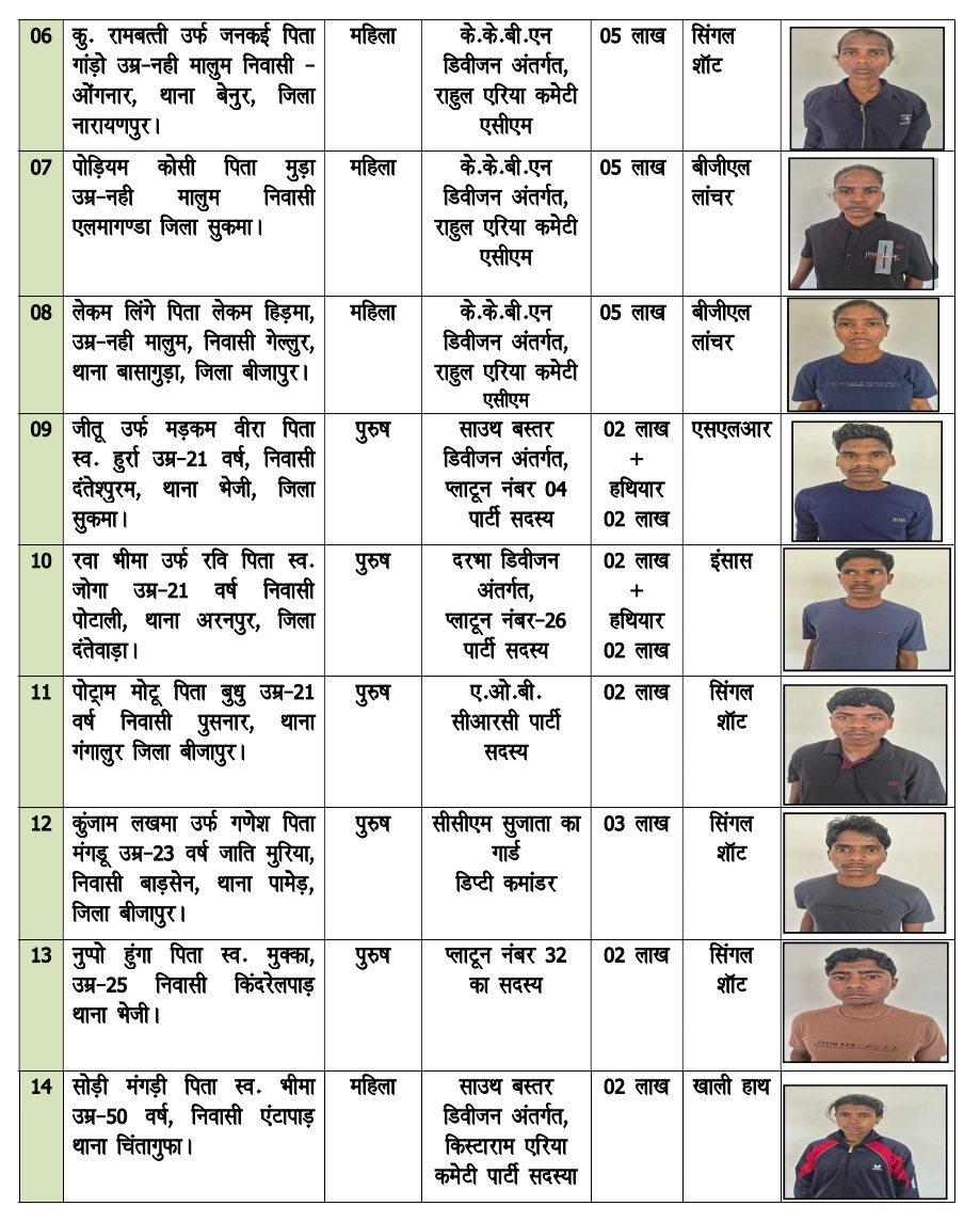 आत्मसमर्पित माओवादियों में 3 डीवीसीएम, 5 एसीएम और 13 पार्टी सदस्य शामिल हैं, जिनमें 14 महिलाएं भी हैं। ये सभी दरभा डिवीजन, दक्षिण बस्तर डिवीजन, एओबी डिवीजन, केकेबीएन (ओड़िशा) तथा इंद्रावती एरिया कमेटी में सक्रिय रूप से कार्यरत थे। आत्मसमर्पण के दौरान उनके पास से AK-47, एसएलआर, इंसास, बीजीएल लांचर सहित भारी मात्रा में गोला-बारूद भी बरामद किया गया।