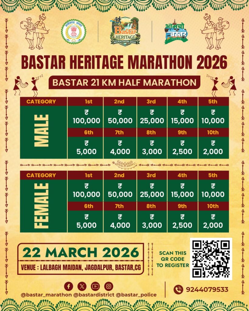 जिला प्रशासन द्वारा आयोजित इस मैराथन का उद्देश्य खेल के माध्यम से बस्तर की विरासत को चमकाना है। यदि आप भी अपनी रफ्तार के दम पर इन बड़े पुरस्कारों को अपने नाम करना चाहते हैं, तो 22 मार्च की सुबह लालबाग मैदान में अपनी उपस्थिति दर्ज कराएं। विस्तृत जानकारी या सहायता के लिए हेल्पलाइन नंबर 9244079533 पर संपर्क किया जा सकता है।